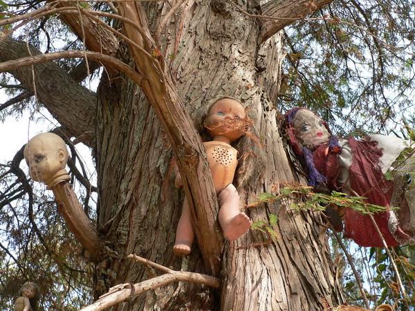 hàng trăm con búp bê đủ loại, nhiều con đã mục rữa, thiếu tay chân hoặc mất mắt, treo rải rác khắp đảo.