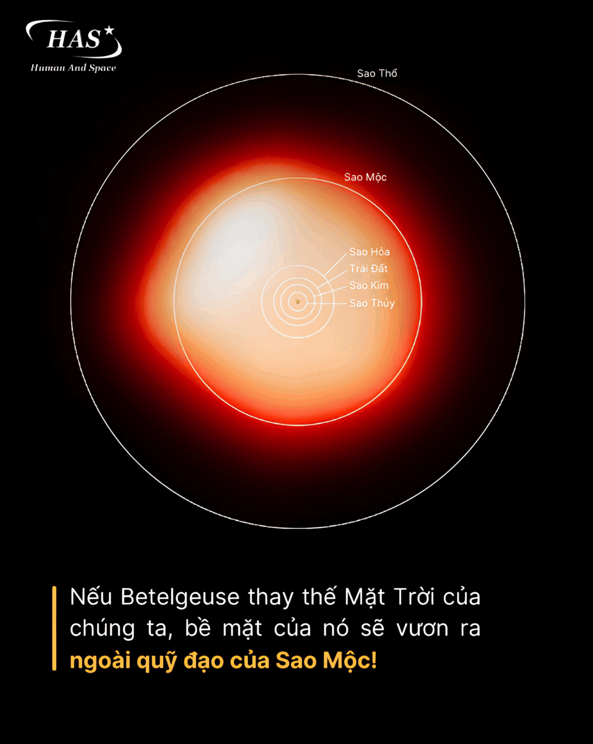 Câu nói “bề mặt của nó sẽ vươn ra ngoài quỹ đạo của Sao Mộc” không phải là một sự cường điệu. Sao Betelgeuse lớn đến mức nếu đặt nó vào vị trí của Mặt Trời: